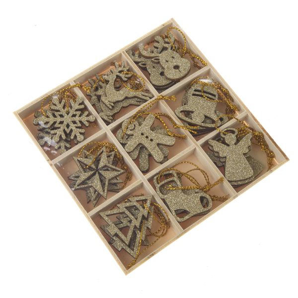 Dřevěné vánoční ozdoby v krabičce - zlatá - sada 36 ks, 72/144